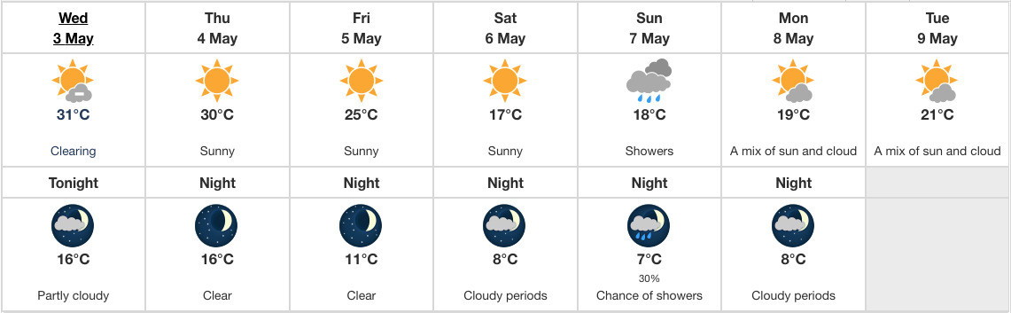 As we speak: Clearing this morning. Wind changing into southeast 20 km/h gusting to 40 this morning. Excessive 31. UV index 6 or excessive.