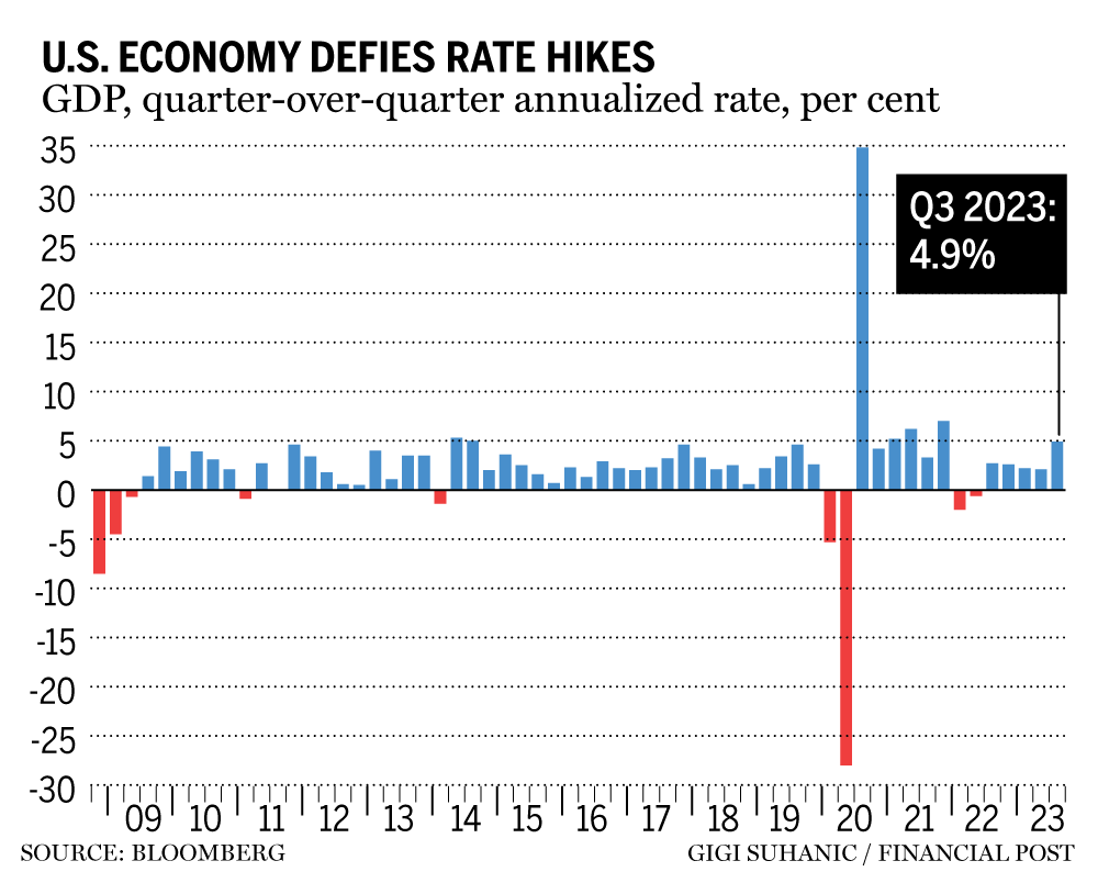 The United States economy grew at the fastest pace in nearly two years last quarter on a burst of consumer spending, which will be tested in coming months. Gross domestic product accelerated to a 4.9 per cent annualized rate, more than double the second-quarter pace, according to the government’s preliminary estimate Thursday. The economy’s main growth engine — personal spending — jumped four per cent, also the most since 2021. — Bloomberg