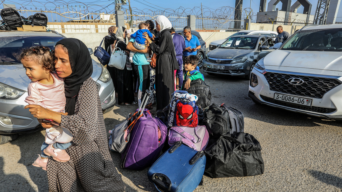 Palestinians with foreign passports wait to cross the Rafah Border Gate into Egypt.