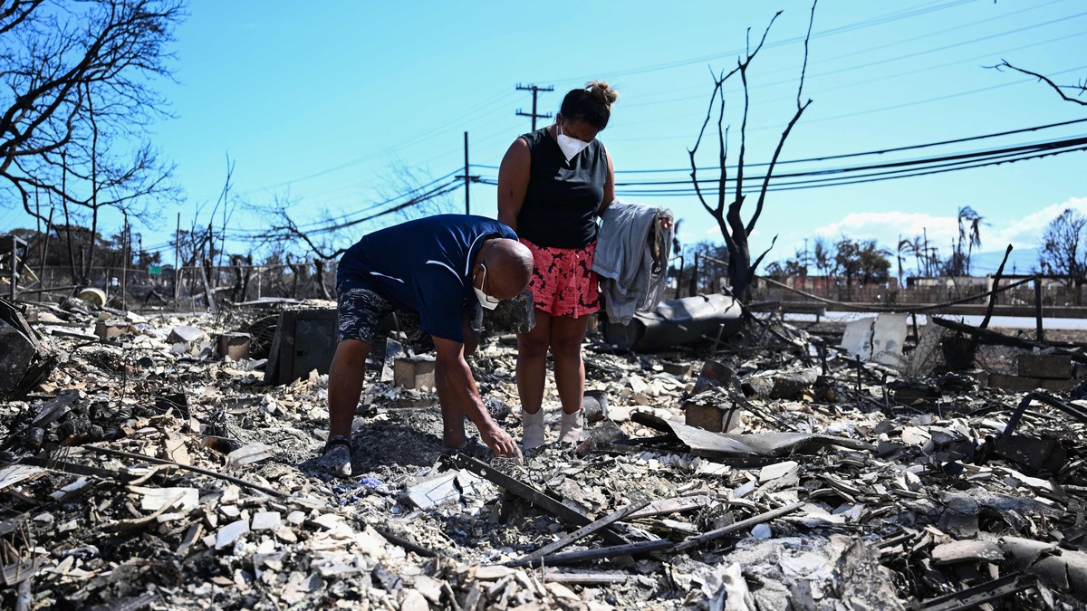 Davilynn Severson and Hano Ganer look for belongings through the ashes of their family’s home on Friday in the aftermath of a wildfire in Lahaina, in western Maui, Hawaii.